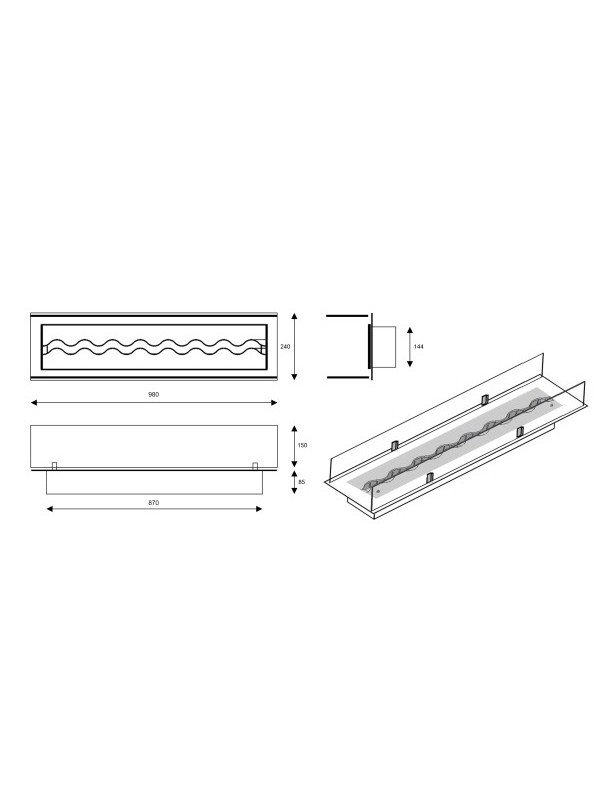 Per dare una maggiore sicurezza agli inserti, destinati all'installazione su superfici come, ad esempio, mobili o direttamente nel muro, è stato costruito uno speciale contenitore protettivo. Infatti, il bruciatore è costituito nella parte inferiore da un contenitore realizzato in lamiera di 2 mm di spessore, verniciato a polvere con una vernice resistente al calore di colore nero semi-opaco. Al suo interno è presente un rivestimento in spugna di ceramica (stuoia di alluminosilicato): non infiammabile, resistente a temperature fino a 1260 ° C - non si scioglie, assorbe molto bene il bioetanolo ed impedisce di farlo uscire fuori dal bruciatore.