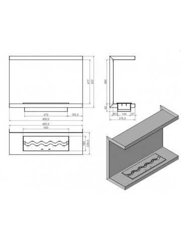 Three-sided built-in bio-fireplace, made of 1.5mm thick steel and powder coated with heat-resistant matt black paint.