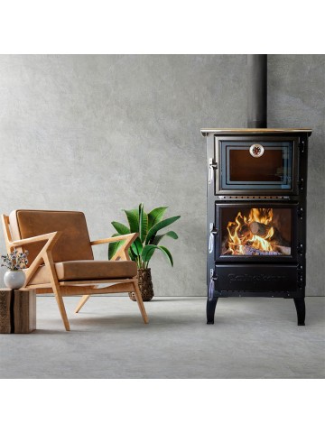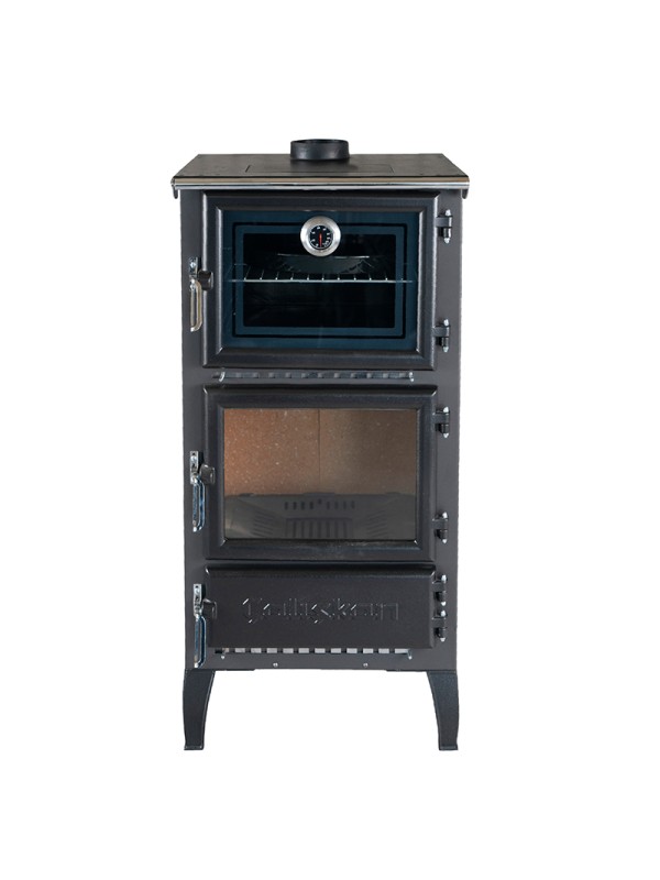 Den emaljerade ugnen, placerad ovanför förbränningskammaren, ger funktionalitet till komfort, vilket gör denna kamin till ett mittpunkt för värme och tradition. Dess smarta ugnsventil säkerställer att matlukter leds direkt genom rökgången, vilket håller köksluften ren medan dina diskar tillagas jämnt tack vare strålningsvärme.