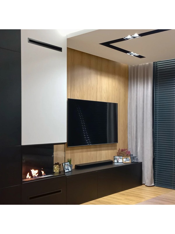 Den inbyggda biokaminen levereras med alla nödvändiga komponenter för installation, såsom monteringsskenor, skruvar och glasfästen! Biokaminen måste hängas minst 50 cm från brandfarligt material.