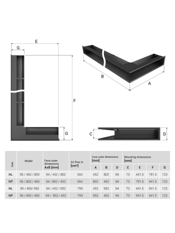 Hörnventilationsgaller för öppen spis 95x800x450 - Loft Angle höger/vänster
